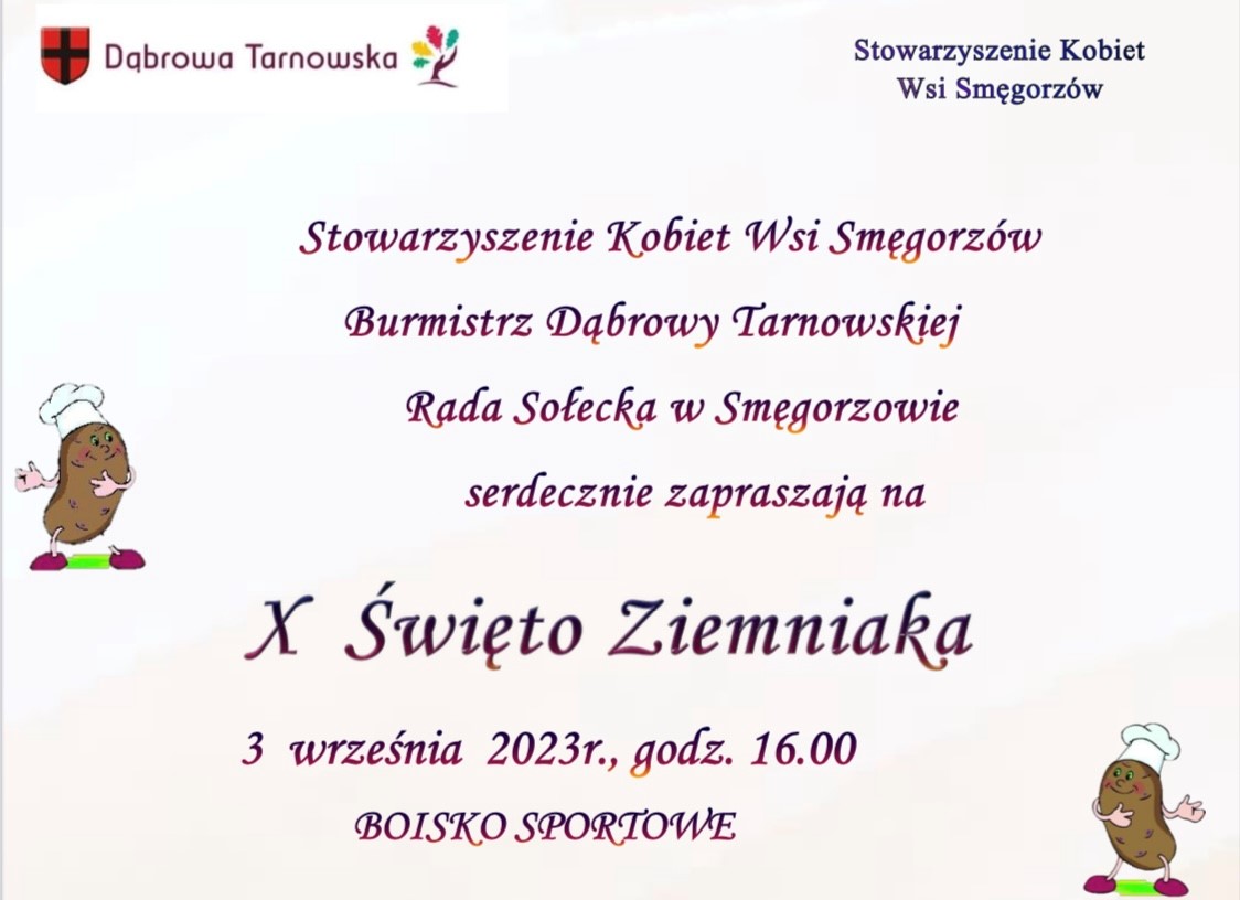 Stowarzyszenie Kobiet Wsi Smegorzów i Urząd Miejski w Dąbrowie Tarnowskiej serdecznie zapraszają na festyn rodzinny – „X Święto Ziemniaka w Smęgorzowie – dzieci i młodzież aktywnie spędzają czas wolny”. To impreza, która na stałe wpisała się do kalendarza wydarzeń gminnych i cieszy się ogromną popularnością. W tym roku odbędzie się 3 września na boisku sportowym w Smęgorzowie od godziny 16:00. W bogatym programie przewidziano występy artystyczne, liczne konkursy i zabawy dla dzieci, młodzieży i dorosłych, strefę dla dzieci z kącikiem plastycznym, dmuchanym placem zabaw, wata cukrową i popcornem. Zaplanowano pokaz baniek mydlanych, kolorowe warkoczyki i tatuaże Nie zabraknie tradycyjnego ogniska z pieczonymi ziemniakami i kiełbaską. Skosztować będzie można pysznej zupy „Rzodkie ziemnioki” Teresy Rygielskiej i innych smakołyków przygotowanych przez panie z Kół Gospodyń z naszego regionu. Członkinie SKWS przygotują również wystawę rękodzieła ludowego. Czytaj dalej sie25