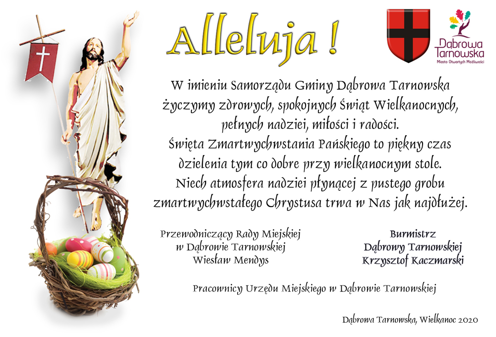 Burmistrz Dąbrowy Tarnowskiej informuje, że w dniu 10 kwietnia 2020 r. tj, w Wielki Piątek – Urząd Miejski w Dąbrowie Tarnowskiej będzie pracował w godzinach: 8:00 – 11:00. Korespondencja w formie papierowej będzie przyjmowana poprzez wrzutnię dziennika podawczego Urzędu w godzinach: 8:00 – 15:00. W tym dniu będzie dyżur Urzędu Stanu Cywilnego w godz.: 11:00 - 13:00.