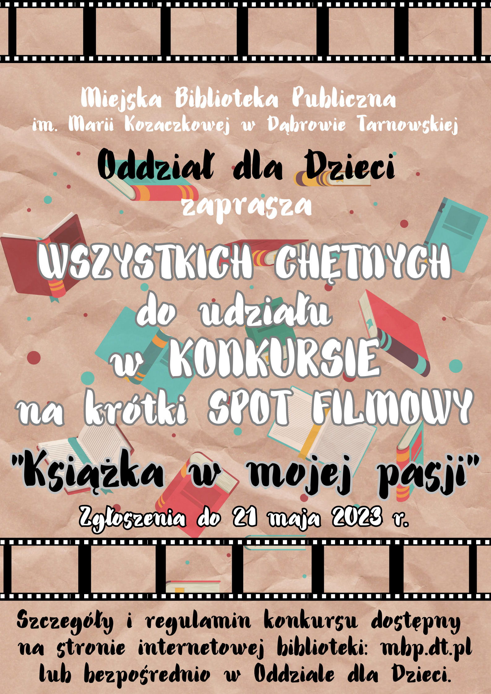 Oddział dla Dzieci Miejskiej Biblioteki Publicznej im. Marii Kozaczkowej w Dąbrowie Tarnowskiej zachęca do udziału w konkursie na krótki spot filmowy przedstawiający spędzanie wolnego czasu na realizacji swojego hobby i książek pomagających w tej pasji.