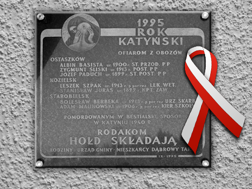Samorząd gminny wraz z Parafią NMP Szkaplerznej w Dąbrowie Tarnowskiej i Szkołą Podstawową nr 3 w Dąbrowie Tarnowskiej zapraszają mieszkańców na uroczysty apel z okazji Dnia Pamięci Ofiar Zbrodni Katyńskiej. Apel odbędzie się 17 kwietnia br. (tj. poniedziałek) o godz. 11:00 przed Tablicą Katyńską umieszczoną na ścianie Kaplicy Cmentarnej przy ul. Św. B. A. Chmielowskiego.