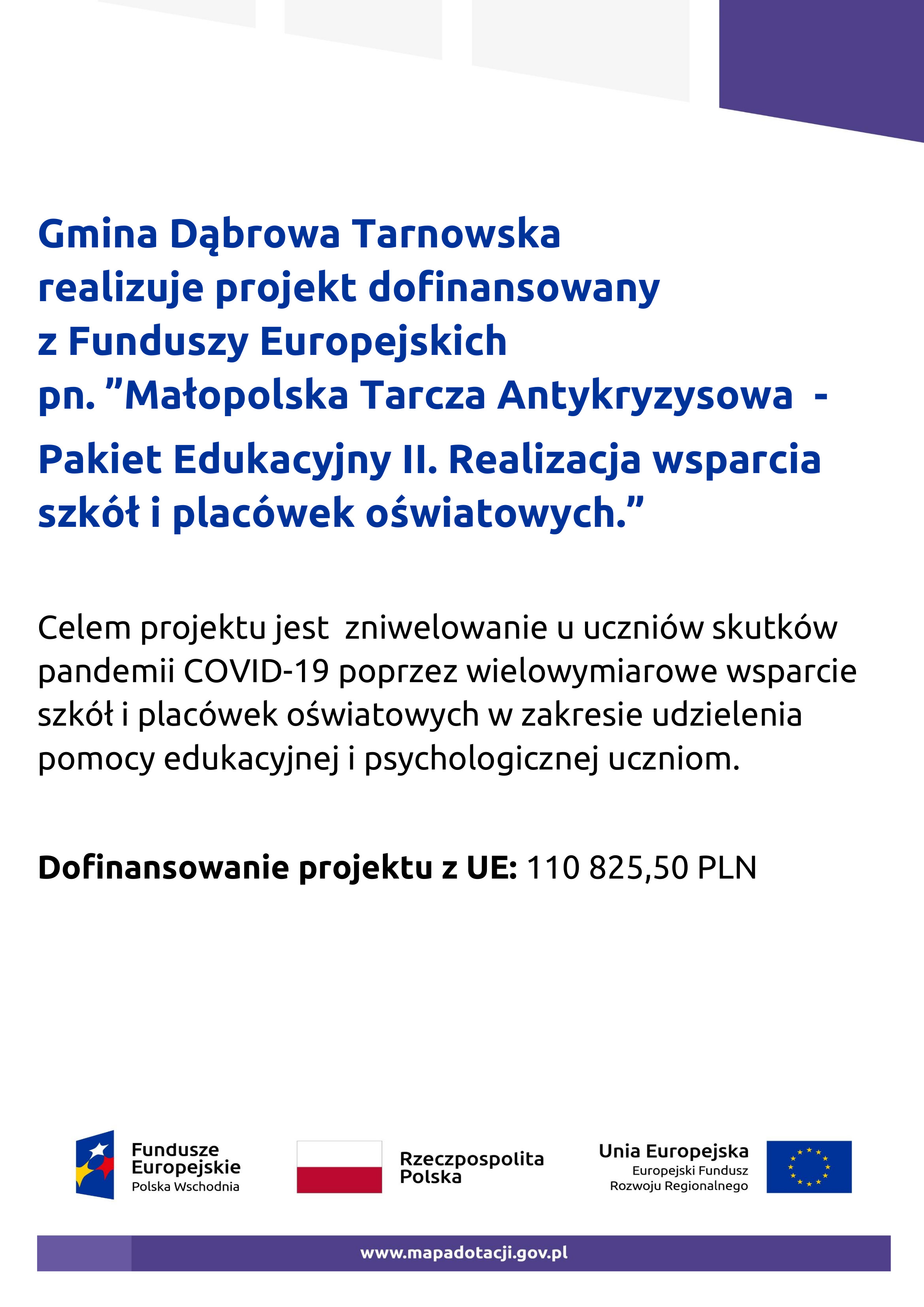 Gmina Dąbrowa Tarnowska otrzymała dofinansowanie na realizację Grantu 3 w ramach „Małopolskiej Tarczy Antykryzysowej – Pakiet Edukacyjny II. Realizacja wsparcia szkół i placówek oświatowych” 10 Oś Priorytetowa Wiedza i kompetencje Działanie 10.1 Rozwój Kształcenia Ogólnego Poddziałanie 10.1.6 Cyfryzacja szkół prowadzących kształcenie ogólne RPO WM na lata 2014-2020 na zajęcia indywidualne i grupowe z młodzieżą borykającą się z problemami w związku ze skutkami pandemii COVID -19. Czytaj dalej gru16