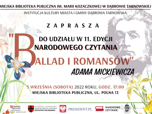 Miejska Biblioteka Publiczna im. Marii Kozaczkowej w Dąbrowie Tarnowskiej zaprasza do udziału w 11. edycji Narodowego Czytania. Lekturą tegorocznej akcji są „Ballady i romanse” autorstwa wieszcza narodowego Adama Mickiewicza. Wybór utworów podyktowany jest 200. rocznicą ich wydania oraz ogłoszeniem przez Sejm Rzeczypospolitej Polskiej bieżącego roku Rokiem Romantyzmu Polskiego. Publikacja „Ballad i romansów” była wydarzeniem na tyle przełomowym, że dała początek epoce romantyzmu w naszym kraju.