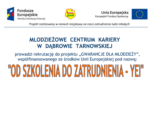 Młodzieżowe Centrum Kariery w Dąbrowie Tarnowskiej prowadzi rekrutację do projektu „Gwarancje dla Młodzieży" wspófinansowanego ze środków Unii Europejskiej pod nazwą „Od szkolenia do zatrudnienia - YEI”. Projekt obejmuje: bezpłatne szkolenia zawodowe uczestnicy otrzymują stypendium szkoleniowe staże zawodowe 3 m-ce, uczestnicy otrzymują m. ni.: stypendium stażowe KURSY: językowy, obsługi programów komputerowych, ECDL, kurs prawa jazdy kat. B. Projekt realizowany w ramach Inicjatywy na rzecz zatrudnienia ludzi młodych