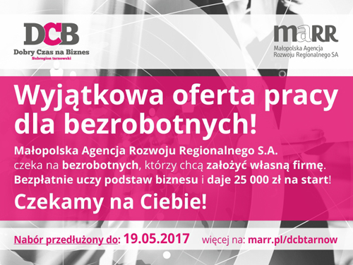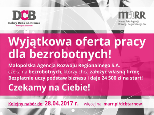 Małopolska Agencja Rozwoju Regionalnego S.A. jako realizator projektu „Dobry Czas na Biznes – Subregion Tarnowski” współfinansowanego z Europejskiego Funduszu Społecznego w ramach działania 8.3.1. Regionalnego Programu Operacyjnego Województwa Małopolskiego na lata 2014 - 2020 zaprasza do wzięcia udziału w ww. projekcie osoby zamieszkujące powiat dąbrowski chcące założyć własną działalność gospodarczą. Oferujemy bezzwrotną dotację w wysokości do 24 500 zł. na otwarcie działalności gospodarczej, a także wsparcie w postaci szkolenia i doradztwa. Istnieje również możliwość otrzymania rocznego bezpłatnego, indywidualnego i profilowanego wsparcia doradczego w zakresie księgowości, prawa i utrzymania firmy na rynku. Czytaj dalej