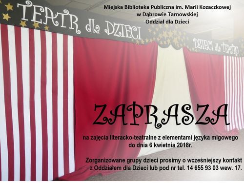 Oddział dla Dzieci w Miejskiej Bibliotece Publicznej im. Marii Kozaczkowej w Dąbrowie Tarnowskiej zachęca zorganizowane grupy dzieci w różnym wieku do "zabawy w teatr" z elementami języka migowego. Wielka wyobraźnia dzieci, potrzeba ruchu i twórczości wykorzystywana będzie podczas m.in. : autoprezentacji, zabaw pantomimicznych, krótkich inscenizacji z nietypowymi lalkami teatralnymi, układów choreograficznych, prostych scenek dramowych w oparciu o bajki i wiersze znanych autorów polskich. Dzieci będą nie tylko widzami, ale głównie aktorami, lalkarzami, animatorami, a dodatkowo w tę zabawę z tekstem literackim wplecione zostaną elementy języka migowego. Wszystko po to, aby pokazać zalety komunikacji pozawerbalnej, ćwiczyć precyzję ruchu, gestykulację, koordynację... I oczywiście będzie dużo czytania, czytania i czytania. Czytaj dalej