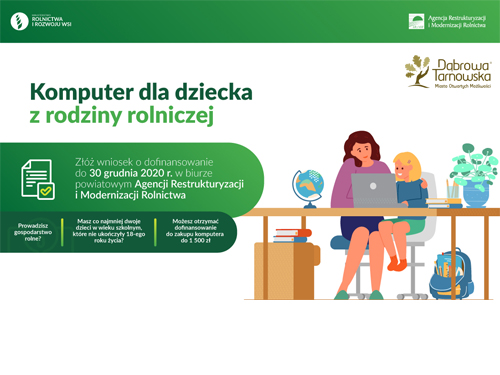 Rodzina prowadząca gospodarstwo rolne, w skład której wchodzi co najmniej dwoje dzieci w wieku szkolnym, które nie ukończyły 18-ego roku życia może ubiegać się od dofinansowanie zakupu komputera stacjonarnego lub przenośnego do kwoty 1 500 zł. Wnioski o dofinansowanie zakupu komputera można składać do Biur Powiatowych Agencji Restrukturyzacji i Modernizacji Rolnictwa do 30 grudnia 2020 r. Czytaj dalej