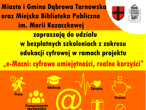 Jesteś mieszkańcem Gminy Dąbrowa Tarnowska? Chcesz się dalej rozwijać, nabyć nowe umiejętności? A może jeszcze nie umiesz obsługiwać komputera? Jesteś niepełnosprawny? Te szkolenia są także dla Ciebie!!! Skorzystaj z szerokiej oferty projektu „e-Mocni: cyfrowe umiejętności, realne korzyści”. Dzięki projektowi możesz za darmo podnieść swoje umiejętności w sferze obsługi komputera i Internetu. To nic nie kosztuje, musisz się tylko zgłosić do Miejskiej Biblioteki Publicznej im. Marii Kozaczkowej w Dąbrowie Tarnowskiej i przyjść na szkolenie. Pracownicy biblioteki pomogą Ci wypełnić wszystkie konieczne dokumenty. Poczuj się zaproszony. Czytaj dalej