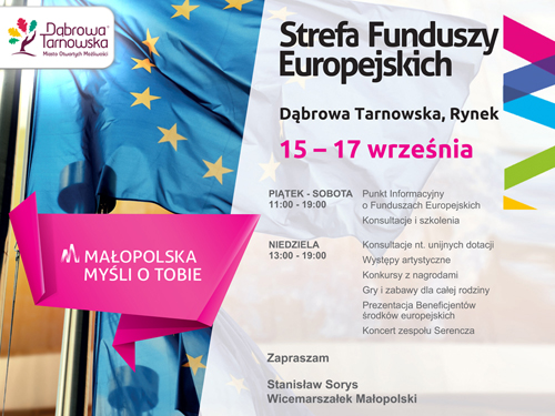 Strefa Funduszy Europejskich "Małopolska Myśli o Tobie" to 3-dniowe spotkania ze specjalistami ds. Funduszy Europejskich. Na kolejne spotkanie z tego cyklu zapraszamy do Dąbrowy Tarnowskiej od 15-17 września na Rynek. Przez trzy dni w SFE będzie można zasięgnąć wszelkich informacji o Funduszach Europejskich. Poruszone będą najgorętsze tematy związane z funduszami unijnymi, jak: przedsiębiorczość, ekologia, usługi społeczne, innowacje. Będzie można spotkać się ze specjalistami z Sieci Punktów Informacyjnych Funduszy Europejskich i dowiedzieć się między innymi: dlaczego warto korzystać z Odnawialnych Źródeł Energii? czym jest aktywizacja społeczna i zawodowa? czy masz szanse na założenie działalności gospodarczej? jak prace badawcze wpływają na nasze codzienne życie? dlaczego wymiana kotłów jest tak ważna? czym jest PO WER? czy masz szansę na „Karierę”? Czytaj dalej