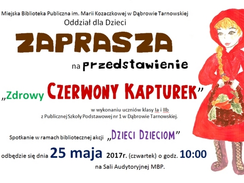 Oddział dla dzieci Miejskiej Biblioteki Publicznej im. Marii Kozaczkowej w Dąbrowie Tarnowskiej zaprasza w najbliższy czwartek 25 maja br. na przedstawienia "Zdrowy Czerwony Kapturek" w wykonaniu uczniów klas I a i II b Publicznej Szkoły Podstawowej Nr 1 w Dąbrowie Tarnowskiej. Spotkanie odbywa się w ramach bibliotecznej akcji "Dzieci Dzieciom" w Sali Audytoryjnej MBP. Przedstawienie rozpocznie się o godz. 10:00. Czytaj dalej