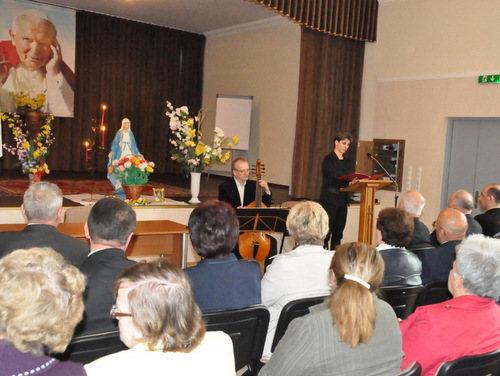 W czwartek 21 maja br. w auli Domu Katechetycznego w Dąbrowie Tarnowskiej Katolickie Stowarzyszenie Civitas Christiana wraz z zaproszonymi gośćmi uczciło pierwszą rocznicę kanonizacji Jana Pawła II oraz 95. rocznicę jego urodzin. Uroczystość uświetnił wykład ks. dra Jana Bartoszka, Asystenta Akcji Katolickiej Diecezji Tarnowskiej pt. „Maryjna droga do świętości Jana Pawła II” oraz program słowno-muzyczny w wykonaniu artystów scen krakowskich. Refleksje nad twórczością poetycką Karola Wojtyły zaprezentowali recytatorka Magdalena Markiewicz i muzyk Marek Skrukwa, grający na dawnym instrumencie viola da gamba. Spotkanie prowadził Prezes Miejskiego Oddziału Civitas Christiana w Dąbrowie Tarnowskiej Edward Urbańczyk. Wśród zaproszonych gości byli: Dyrektor Oddziału Okręgowego „Civitas Christiana” w Krakowie – Bożena Pruska, Ks. Prałat Józef Poremba, Zastępca Burmistrza Dąbrowy Tarnowskiej Stanisław Ryczek oraz Przewodniczący Rady Miejskiej Jacek Sarat. Obecni byli także członkowie Związku Emerytów Rencistów i Inwalidów z Przewodniczącym Marianem Łączyńskim, a także radne miejskie – Józefa Taraska i Kazimiera Wąż oraz radna powiatowa – Anna Witowska. Czytaj dalej