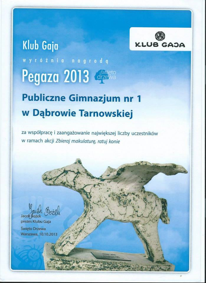 Warszawski „Klub Gaja” wyróżnił Publiczne Gimnazjum Nr 1 im. Jerzego Brauna statuetką PEGAZA 2013. Nasza placówka została laureatem III miejsca w Polsce w kategorii za współpracę i zaangażowanie największej liczby uczestników w ramach akcji „Zbieraj makulaturę, ratuj konie”. Statuetkę odebrały uczennice naszego gimnazjum w Dniu Święta Drzewa tj. 10 X 2013r. w Warszawie z rąk prezesa Klubu Gaja - pana Jacka Bożka. Uroczystość odbywała się w siedzibie Biblioteki Narodowej. Czytaj dalej paź23
