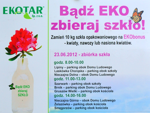 Na terenie gminy Dąbrowa Tarnowska przeprowadzono akcję zbiórki szkła, tj. słoiki, butelki, opakowania po kosmetykach i inne opakowania szklane. Akcję przeprowadziła firma EKOTAR Sp. z o.o. z siedzibą w Tarnowie, której hasło przewodnie brzmi: bądź EKO zbieraj szkło!!!. Dodatkową motywacją do oddania odpadów szklanych były EKObonusy w postaci kwiatów, nasion i nawozów za każde 10 kg oddanego szkła opakowaniowego. Czytaj dalej lip10