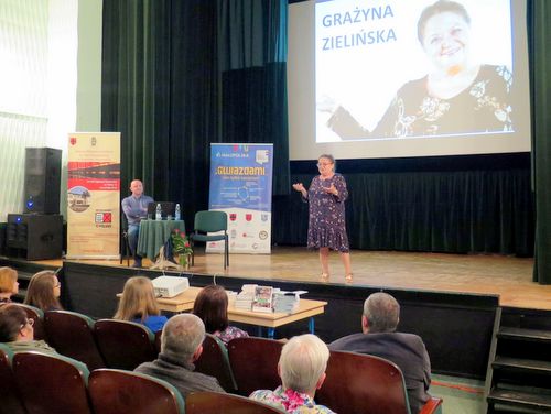 W piątkowe popołudnie 14 września br. w Dąbrowskim Domu Kultury odbyło się kolejne wydarzenie w ramach projektu „Z gwiazdami… nie tylko zaczytani” finansowanego ze środków Województwa Małopolskiego w II Edycji Budżetu Obywatelskiego. Dąbrowska publiczność miała możliwość wzięcia udziału w spotkaniu z lubianą aktorką teatralną i filmową Grażyną Zielińską, znaną szerszej publiczności z ról w takich serialach jak „Ranczo”, „Pierwsza miłość” i „Na dobre i na złe”. Grażyna Zielińska jest absolwentką wrocławskiej filii PWST w Krakowie. Od 1986 roku pracuje w Teatrze Dramatycznym im. Jerzego Szaniawskiego w Płocku. W 2002 roku odznaczona została Srebrnym Krzyżem Zasługi. Od 2007 roku występuje w spektaklu komediowym pt. „Klimakterium i już…”. Dąbrowskie spotkanie z aktorką prowadził Dariusz Rekosz pisarz, animator kultury i felietonista. Artystka z wielkim humorem i dystansem opowiedziała o ścieżce swojej kariery zawodowej od studiów teatralnych po role w znanych serialach. Czytaj dalej