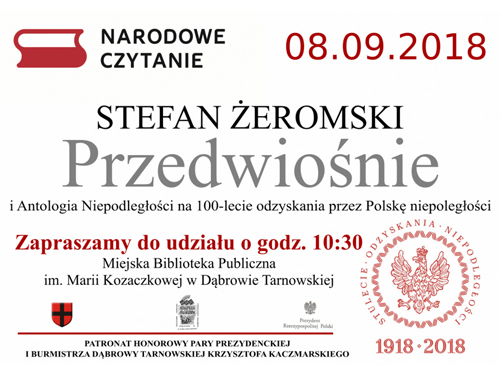 Miejska Biblioteka Publiczna serdecznie zaprasza na tegoroczną odsłonę Narodowego Czytania, które odbędzie się 8 września o 10:30. Rok 2018 to czas świętowania 100-lecia odzyskania przez Polskę niepodległości, stąd wyjątkowa formuła akcji, podczas której czytane będą aż dwie lektury. Lekturą Narodowego Czytania 2018 jest „Przedwiośnie” Stefana Żeromskiego. Ponadto Para Prezydencka proponuje do czytania przez cały rok 44 teksty Antologii Niepodległości. Czytaj dalej