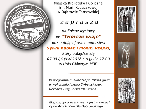 „Twórcze wizje” to tytuł ekspozycji prezentującej twórczość młodych artystek Powiśla Dąbrowskiego, współpracujących z Miejską Biblioteką Publiczną. Finisaż tych prac Sylwii Kubiak i Moniki Rzepka odbędzie się w najbliższy piątek 7 września o godz. 17:00 w holu dąbrowskiej biblioteki. Bedzie on zwieńczeniem prezentowanej w okresie wakacyjnym wystawy. W programie wydarzenia przewidziano również minirecital pt. „Blues gruz” w wykonaniu Jakuba Dybowskiego, Norberta Gizy i Ryszarda Streba. Czytaj dalej
