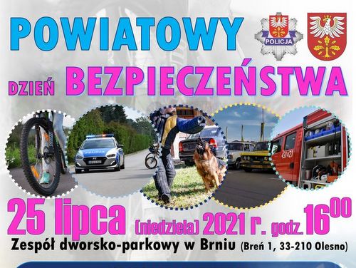 Starostwo Powiatowe w Dąbrowie Tarnowskiej wraz z Komendą Powiatową Policji w Dąbrowie Tarnowskiej serdecznie zapraszają na Powiatowy Dzień Bezpieczeństwa, który odbędzie się w niedzielę 25 lipca 2021 roku o godzinie 16:00 w zespole dworsko-parkowym w Brniu (Breń 1, 33-210 Olesno). Przygotowano mnóstwo atrakcji, zarówno dla dzieci, jak i dorosłych. Między innymi Zakręcone Rowery, które są absolutną nowością na rynku imprez plenerowych. Do dyspozycji dzieci i dorosłych będzie 8 nietypowych rowerów, które będą mogli przetestować na specjalnym torze przeszkód. Oprócz rowerów w strefie znajdować się będą alkogogle i refleksomierz. Dla pasjonatów motoryzacji zorganizowano III Zlot Pojazdów Zabytkowych. Czytaj dalej