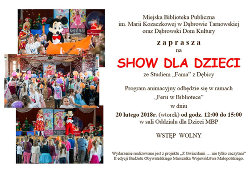 Miejska Biblioteka Publiczna im. Marii Kozaczkowej w Dąbrowie Tarnowskiej i Dąbrowski Dom Kultury wspólnie zapraszają na „Show dla Dzieci” ze Studiem „Fama” w Dębicy. Program animacyjny przeprowadzony zostanie w ramach „Ferii w Bibliotece” we wtorek 20 lutego 2018 r. od godz. 12:00 do godz. 15:00 w Sali Oddziału dla Dzieci dąbrowskiej biblioteki. Wydarzenie realizowane jest z projektu „Z Gwiazdami… nie tylko zaczytani” II Budżetu Obywatelskiego Marszałka Województwa Małopolskiego.