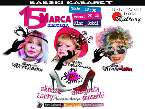 „Z żartami jest jak z matematyką. Wszystko musi być precyzyjnie przygotowane” – dowodzą w rozmowie z Lidią Drabarek trzy znakomite artystki: Emilia Krakowska, Lidia Stanisławska i Barbara Wrzesińska. W najbliższą niedzielę 15 marca o godz.18:00 gościć będą w Dąbrowskim Domu Kultury ze swoim programem satyrycznym „Babski Kabaret - Old Spice Girls”. Program oparty jest na tekstach Marii Czubaszek, Mariana Hemara i Zbigniewa Korpolewskiego oraz klasyków z Julianem Tuwimem na czele. Czytaj dalej