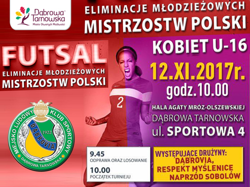 12 listopada 2017 w Hali A. Mróz – Olszewskiej rozegrany zostanie Turniej Kwalifikacyjny Młodzieżowych Mistrzostw Polski w futsalu kobiet U-16. W turnieju wystąpią drużyny: Respekt Myślenice, Naprzód Sobolów i oczywiście MLKS „Dąbrovia”. Zwycięzca turnieju zakwalifikuje się do turnieju finałowego, który rozgrywany będzie we Wrocławiu na obiektach Ślęzy Wrocław w dniach 2-3 grudnia 2017 r. Zapraszamy do odwiedzenia dąbrowskiej hali i kibicowania naszym. Zawodniczkom. Rozpoczęcie turnieju o godzina 10:00. Czytaj dalej