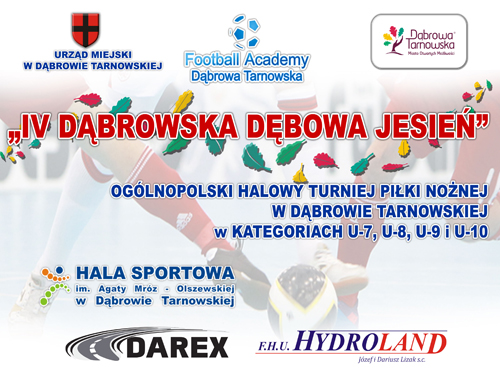 Przed nami cykl halowych turniejów piłki nożnej dzieci w wieku 7-10 lat. To już IV Edycja Dąbrowskiej Dębowej Jesieni, której organizatorem jest Urząd Miasta i Dąbrowska Szkółka Piłkarska Football Academy. Do Dąbrowy Tarnowskiej, na Halę Sportową im. Agaty Mróz – Olszewskiej przez najbliższe trzy weekendy zawita 32 drużyny czyli blisko czterystu najmłodszych adeptów piłki nożnej z południowej Polski. Wśród zaproszonych drużyn jest m.in.: Korona Kielce, Bruk Bet Termalica, AP Mielec, Proszowianka, Skawa Wadowice, FA Jędrzejów. Już w najbliższą niedzielę 19 listopada rywalizować będą zawodnicy rocznika 2009, pierwszy mecz o 9:00. 25 listopada – rocznik 2007, 26 listopada – rocznik 2010, 2 grudnia – rocznik 2008 . Dobra zabawa i wiele emocji gwarantowane! Zapraszamy na dąbrowska Halę Sportową i kibicowania drużynie gospodarzy Football Academy Dąbrowa Tarnowska. Czytaj dalej