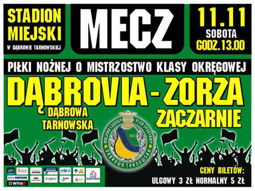 Zapraszamy na ostatni mecz drużyny seniorskiej MLKS Dąbrovii Dąbrowa Tarnowska w rudzie jesiennej sezonu 2017/18. Na Stadion Miejskim w Dąbrowie Tarnowskiej w Święto 99. Rocznicy Odzyskania Niepodległości 11 listopada 2017 o godzinie 13:00 zawodnicy Dąbrovii rozegrają mecz kończący tak dobry półmetek sezonu piłkarskiego będą na szczycie tabeli. Rywalem będzie drużyna Zorza Zaczarnie, zajmująca 8 miejsce w tabeli z dorobkiem 21 punktów. Bardzo ważny mecz dla naszej drużyny, tylko zwycięstwo daje nam realne szanse utrzymać pierwsze miejsce w tabeli. Zapraszamy wszystkich naszych sympatyków do oglądania i kibicowania Dąbrovii. Czytaj dalej