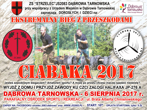 6 sierpnia, nazajutrz po Apelu Poległych ku czci Załogi bombowca Halifax JP-276A, odbyła się kolejna edycja zawodów Ciabaka 2017 – ekstremalnego biegu z przeszkodami, które zostały zorganizowane przez ZS „Strzelec” JS 2083 Dąbrowa Tarnowska przy współpracy z Urzędem Miejskim w Dąbrowie Tarnowskiej. Ciabaka, której I edycja miała miejsce rok temu, pomyślana została jako sportowo – paramilitarne, uczczenie pamięci załogi bombowca Halifax, który w nocy z 4 na 5 sierpnia 1944 r. został zestrzelony i rozbił się w Dąbrowie Tarnowskiej. Ten ekstremalny bieg z przeszkodami to impreza organizowana dla tych, którym nie straszne jest błoto, czołganie się pod oponami, w trawie, w piasku. W zawodach dla dorosłych wzięło udział 50 zawodników z Dąbrowy Tarnowskiej, Tarnowa, Mielca, Baranowa Sandomierskiego, Dębicy, Żabna, Podhala i okolic tych miejscowości. Na torze dla dzieci wystartowało 30 młodszych zawodników. Biegacze mieli do pokonania około 3 km tor przeszkód.