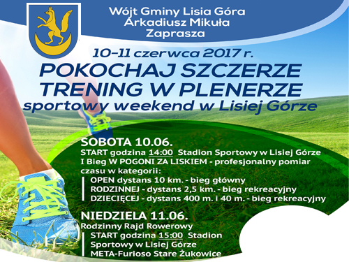 Wójt Gminy Lisia Góra zaprasza do udziału w organizowanej na Stadionie Sportowym w Lisiej Górze dwudniowej imprezie pn. „Pokochaj szczerze trening w plenerze – sportowy weekend w Lisiej Górze”. Ta sportowa impreza może być dobrym przetarciem dla wszystkich chętnych, którzy będą brali udział w Rajdzie Rowerowym "Tour de Powiśle", organizowanym przez Jednostkę Strzelecką JS-2083 oraz Urząd Miejski w Dąbrowie Tarnowskiej już 17 czerwca br. Biegaczy, lisiogórskiej imprezy, którzy są chętni do zmierzenia swoich możliwość na trasach przebiegających przez miejscowości gminy Lisia Góra organizatorzy zapraszają w sobotę 10.06.2017 r. Organizatorzy wydarzenia zapewnili elektroniczny pomiar czasu, oraz pamiątkowy medal dla każdego kto ukończy bieg w danej kategorii. Udział w wydarzeniu jest zupełnie bezpłatny. Czytaj dalej