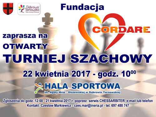 Fundacja Cordare zaprasza w najbliższą sobotę - 22 kwietnia br. - wszystkich chętnych na Otwarty Turniej Szachowy Powiśla Dąbrowskiego o Puchar Fundacji do Hali Sportowej im. Agaty Mróz – Olszewskiej w Dąbrowie Tarnowskiej. Zgłoszenia do udziału w turnieju przyjmowane są jeszcze do godz. 12:00 21 kwietnia br. poprzez serwis chessarbiter, jak również e-mail czes.mar@interia.pl lub telefon 697488747. Turniej Szachowy objął patronatem honorowym Burmistrz Dąbrowy Tarnowskiej Krzysztof Kaczmarski. Czytaj dalej