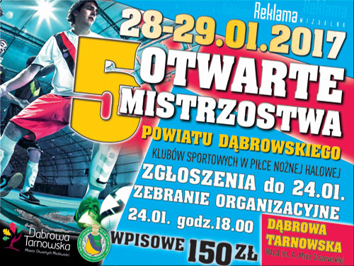 W ostatni weekend stycznia w dniach 28-29 styczna br. w Hali Sportowej im. Agaty Mróz-Olszewskiej rozegrane zostaną Otwarte Mistrzostwa Powiatu Dąbrowskiego Klubów Sportowych w piłce nożnej. Będzie to już V edycja turnieju o zasięgu powiatowym. Zgłoszenia drużyn przyjmowane będą do 24 stycznia br. (wtorek). Tego samego dnia o godz. 18:00 odbędzie się również zebranie organizacyjne. Wpisowe dla drużyn wynosi 150 zl. Organizatorzy w tym MLKS „Dąbrovia” i Urząd Miejski w Dąbrowie Tarnowskiej zapraszają do jak najliczniejszego udziału. Czytaj dalej