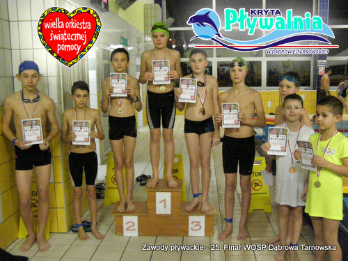 We wtorek 10 stycznia 2017 roku na Krytej Pływalni w Dąbrowie Tarnowskiej przeprowadzone zostaną zawody pływackie w ramach imprez towarzyszących 25 Finałowi Wielkiej Orkiestry Świątecznej Pomocy. Zawody rozpoczną się o godzinie 17:00. Zawodnicy pływać będą, podobnie jak w innych zawodach organizowanych na dąbrowskiej Krytej Pływalni, w kategoriach wiekowych: przedszkolaki 12,5 m, szkoła podstawowa 25 m, gimnazjum 50 m oraz open 50 m. Serdecznie zapraszamy do udziału. Zapisy w kasie Krytej Pływalni w dniu zawodów do godziny 16:45. Wpisowe 2 zł do puszki WOŚP. Uwaga! Informujemy, że na plakatach reklamujących zawody pływackie pojawił się błąd - zawody rozgrywamy we wtorek 10 stycznia, a nie jak wcześniej podawano 6 stycznia!!!