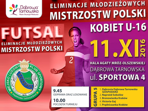 11 listopada 2016 w Hali A. Mróz - Olszewskiej odbędzie się turniej kwalifikacyjny Młodzieżowych Mistrzostw Polski w futsalu kobiet poniżej 16 roku życia (U-16). W turnieju wystąpi drużyna dziewcząt MLKS „Dąbrovia”, a nasz miasto gościć będzie następujące drużyny: Bronowianka Kraków, Victoria Gaj, Naprzód Sobolów, Prądniczanka Kraków. O randze turnieju świadczy fakt, że bezpośredni awans do turnieju finałowego rozgrywanego w Gliwicach wywalczą dwie pierwsze drużyny. Zapraszamy do odwiedzenia dąbrowskiej hali i kibicowania naszym. Zawodniczkom. Rozpoczęcie turnieju o godzina 10:00 w piątek 11 listopada br. Czytaj dalej