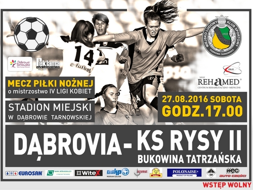 Drużyna piłkarek „Dabrovii” rozegra w najbliższą sobotę 27 sierpnia br. o godz. 17:00 pierwszy w historii mecz piłki nożnej kobiet. Będzie to mecz ligowy rozegrany w ramach mistrzostw IV ligi kobiet. W swoim pierwszym spotkaniu zawodniczki dąbrowskiego klubu zmierzą się z drugą drużyną KS Rysy z Bukowiny Tatrzańskiej. Miejscem zmagań piłkarek będzie oczywiście stadion miejski w Dąbrowie Tarnowskiej. Warto przyjść i wspierać nasze zawodniczki rozpoczynające nowy i ważny etap dla MLKS „Dąbrovia”. Wstęp wolny. Czytaj dalej