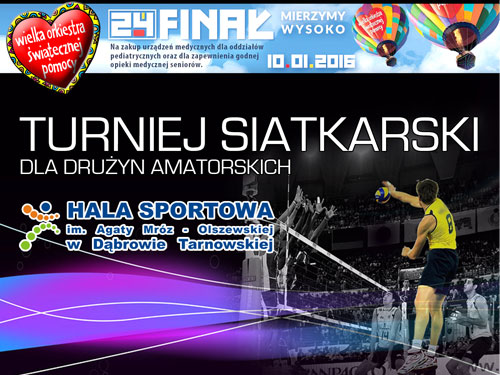 Przed nami tradycyjne turnieje sportowe w ramach „grania” Wielkiej Orkiestry Świątecznej Pomocy w Dąbrowie Tarnowskiej. Jak już wcześniej anonsowaliśmy będą to (nie licząc już rozegranych zawodów pływackich) turnieje piłki nożnej i siatkówki, które odbędą się na Hali Sportowej im. Agaty Mróz - Olszewskiej w Dąbrowie Tarnowskiej. Przedstawiamy garść informacji dotyczących Turnieju Siatkarskiego. Rozgrywki odbędą się na Hali Sportowej im. Agaty Mróz-Olszewskiej w Dąbrowie Tarnowskiej – I etap – eliminacje 9 stycznia 2016 r. od godz. 9:00. Organizatorzy przewidują rozgrywki równolegle w 2-3 grupach eliminacyjnych. II etap – czyli Finał 17 stycznia od godz. 14:00. Zgłoszenia i wpisowe 60 zł od drużyny do dnia 7.01.16 do godz. 18:00 do Sztabu WOŚP w DDK. Serdecznie zapraszamy do udziału w zawodach oraz do kibicowania swoim zespołom. Czytaj dalej
