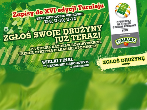 Uprzejmie informujemy, że do 25 września 2015 r. trwają zapisy do XVI edycji ogólnopolskiego turnieju „Z podwórka na stadion o Puchar Tymbarku”. Referat Kultury Fizycznej i Sportu serdecznie zaprasza wszystkich chętnych w wieku do 12 lat do wzięcia udziały w tej sportowej imprezie. W rozgrywkach mogą wziąć udział szkoły podstawowe, uczniowskie kluby sportowe, Akademie Młodych Orłów i inne podmioty w trzech kategoriach wiekowych U-8 (I klasa), U-10 (II i III klasa) U-12 (IV i V klasa). Trenerzy i opiekunowie drużyn mogą zgłaszać swoje zespoły do uczestnictwa w rozgrywkach do 25 września. Czytaj dalej
