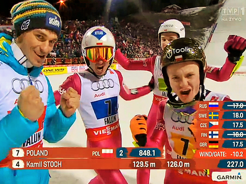 Polscy skoczkowie (w składzie Kamil Stoch, Piotr Żyła, Klemens Murańka, Jan Ziobro) zajęli trzecie miejsce w sobotnim konkursie drużynowym mistrzostw świata w Falun. Na najwyższym stopniu podium stanęli Norwegowie, srebro wywalczyli Austriacy. Zdobywając trzecie miejsce na mistrzostwach świata w Szwecji, Polacy obronili brąz wywalczony przed dwoma laty we włoskim Predazzo. Dziękujemy, Dziękujemy, Dziękujemy ! Czytaj dalej