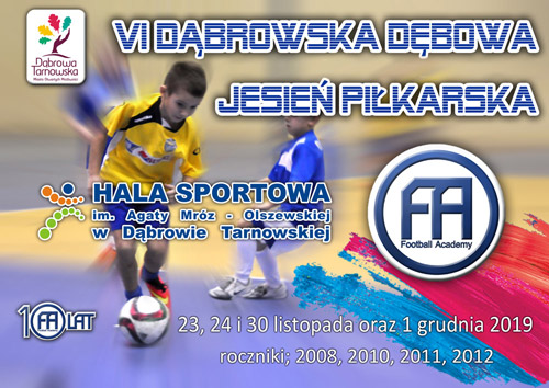 Przez najbliższe dwa weekendy Hala Sportowa im. Agaty Mróz-Olszewskiej oblegana będzie przez najmłodszych adeptów piłki nożnej. Przed nami bowiem VI Edycja Dąbrowskiej Dębowej Jesieni, cyklu halowych turniejów piłki nożnej. Organizatorem i pomysłodawcą tej prestiżowej imprezy jest Football Academy Dąbrowa Tarnowska oraz Urząd Miejski w Dąbrowie Tarnowskiej a Honorowy Patronat przyjęty został przez Burmistrza Dąbrowy Tarnowskiej Krzysztofa Kaczmarskiego. To duże wydarzenie sportowe organizowane jest nieprzerwanie od 6 lat i gromadzi przy każdej edycji blisko 400 młodych zawodników. Czytaj dalej