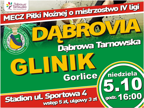 Najbliższy weekend na stadionie miejskim w Dąbrowie Tarnowskiej będzie szansą dla naszych drużyn piłkarskich na poprawienie wyników w tabeli. W sobotę 4 października br. o godz. 16:00 Dąbrovia II zagra przeciw drużynie LZS Olesno. Niedzielne popołudnie 5 października br. będzie natomiast czasem sportowych zmagań MLKS „Dąbrovia”, która zmierzy się z Glinikiem Gorlice. Szanse na zwycięski finał tych spotkań będą większe jeśli nasze drużyny otrzymają wsparcie kibiców. Czytaj dalej