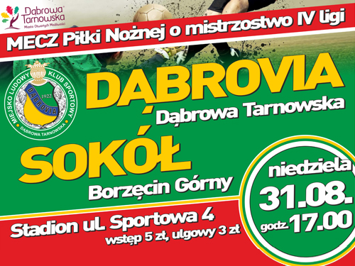 W niedzielne popołudnie 31 sierpnia br. na stadionie miejskim w Dąbrowie Tarnowskiej MLKS „Dąbrovia” zmierzy się z „Sokołem” Borzęcin Górny. Będzie to piąta kolejka w IV lidze i dąbrowska drużyna liczy na swoje pierwsze zwycięstwo w tym sezonie. Rozpoczęcie meczu o godz. 17:00. Ostatni dzień wakacji z „Dąbrovią” na pewno dostarczy wielu sportowych emocji. Czytaj dalej