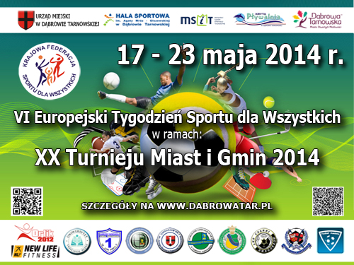Krajowa Federacja Sportu dla Wszystkich pod patronatem Prezydenta Rzeczypospolitej Polskiej, Pana Bronisława Komorowskiego zaprasza serdecznie do uczestnictwa w VI Europejskim Tygodniu dla Wszystkich w ramach którego zostanie rozegrany jubileuszowy XX Turniej Miast i Gmin 2014. Impreza ta rozgrywana jest na terenie całego kraju w dniach od 17 do 23 maja 2014. Ostatnie lata to stała obecność Gmina Dąbrowa Tarnowska w gronie laureatów turnieju. Celem imprezy jest aktywizacja ruchowa jak największej liczby naszych mieszkańców, oraz promowanie aktywności ruchowej, jako najlepszej formy spędzania wolnego czasu i zdrowego stylu życia. Czytaj dalej
