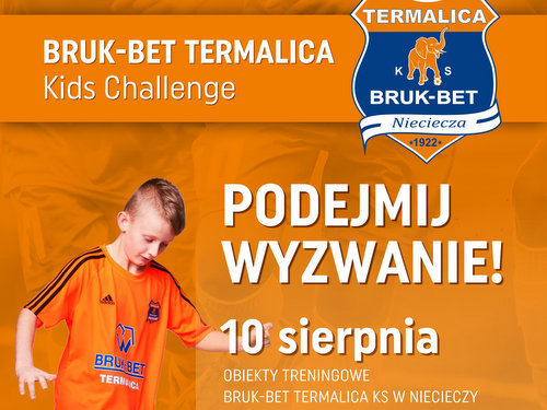 Klub Sportowy Bruk Bet Termalica Nieciecza zaprasza w najbliższą sobotę 10 sierpnia na festiwal piłkarski dla dzieci w wieku 4 - 12 lat. Klub zaprasza wszystkie dzieci kochające piłkę nożną sprawdzenia swoich sportowych umiejętności oraz przeżycia mnóstwa pozytywnych emocji. Przyjdź sprawdź się. Podejmij nasze wyzwanie! Bruk-Bet Termalica Kids Challenge to specjalnie przygotowane 6 piłkarskich wyzwań, podczas których, uczestnicy będą mieli okazję do sprawdzenia swoich umiejętności w biegu, skoku, kontroli nad piłką oraz w grze. Każdy z uczestników otrzyma specjalną kartę wyzwania, na której będzie mógł zaznaczyć swoje najlepsze wyniki a na koniec porównać je z wynikami z całej Polski zebranymi przez Ministerstwo Sportu i Turystyki. Specjalnymi nagrodami wyróżnieni uczestnicy z najlepszymi wynikami całego Festiwalu. Czytaj dalej
