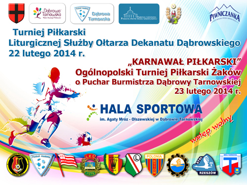 W przyszły weekend sobotę 22-23 lutego br. Hala Sportowa im. Agaty Mróz Olszewskiej będzie miejscem sportowej rywalizacji drużyn piłkarskich. W sobotę 22 lutego rozegrany będzie Turniej Piłkarski Liturgicznej Służby Ołtarza Dekanatu Dąbrowskiego, na który zapraszają ks. Proboszcz Stanisław Cyran i Burmistrz Dąbrowy Tarnowskiej Stanisław Początek. Przypominamy, że drużyna dąbrowskich ministrantów to Mistrz Diecezji Tarnowskiej 2013 r. W niedzielnym turnieju 23 lutego, organizowanym przez Urząd Miejski i Football Academy w Dąbrowie Tarnowskiej, w zawodach o Puchar Burmistrza Dąbrowy Tarnowskiej wystąpią Żaki rocznika 2005 i młodsi. Ten ogólnopolski turniej promujący aktywność fizyczną dzieci, ich rozwój fizyczny i psychiczny przez sport odbędzie sią z udziałem najlepszych drużyn z Polski. Wystąpią m.in.: żaki Legii Warszawa, Korony Kielce, Cracovii, Stali Mielec, Stali Rzeszów, Polonii Bytom, tarnowskiej Tarnovii. Nasze miasto reprezentować będzie FOOTBALL Academy, które z sukcesami wygrywało już wiele turniejów. Czytaj dalej