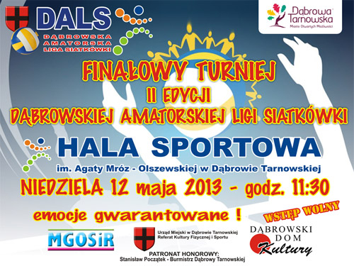 W najbliższą niedzielę 12 maja br. w Hali Sportowej im. Agaty Mróz-Olszewskiej spotkają się cztery najlepsze drużyny Dąbrowskiej Amatorskiej Ligi Siatkówki obecnego sezonu. Finałowa czwórka czyli „Dąbrovia”, „Eurosan Tarnawa”, „Imadła” i „Carpatia” walczyć będzie o Grand Prix DALS. Impreza organizowana jest przez Miejsko-Gminny Ośrodek Sportu i Rekreacji w Dąbrowie Tarnowskiej, Dąbrowski Dom Kultury i Urząd Miejski Dąbrowie Tarnowskiej i objęta patronatem Burmistrza Dąbrowy Tarnowskiej – Stanisława Początka. Czytaj dalej