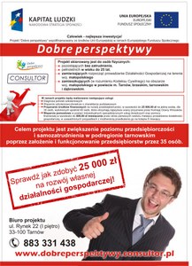 Projekt “Dobre perspektywy” skierowany jest do 40 osób fizycznych pozostających bez zatrudnienia ( w tym studentów), pełnoletnich w wieku do 25 lat, zamierzających rozpocząć prowadzenie działalności gospodarczej na terenie województwa małopolskiego, zamieszkujących (w rozumieniu Kodeksu Cywilnego) na obszarze województwa małopolskiego w powiecie m. brzeskim, tarnowskim i dąbrowskim.Projekt realizowany będzie w Tarnowie przy Rynku 22 obejmuje powiaty: tarnowski, brzeski i dąbrowski. Czytaj dalej