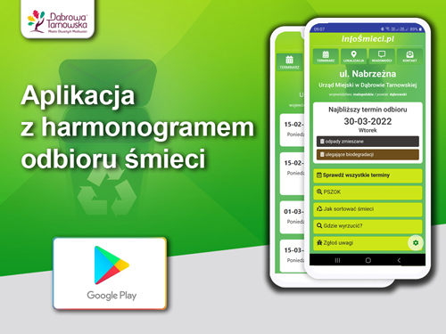 Urząd Miejski w Dąbrowie Tarnowskiej poleca pobranie i zainstalowanie aplikacji InfoŚmieci, która zapewnia łatwy dostęp do aktualnego gminnego terminarza wywozu odpadów na 2022 rok. W aplikacji zawarte są także informacje na temat segregacji odpadów i o Punktach Selektywnej Zbiórki Odpadów PSZOK. Aplikacja InfoŚmieci wyposażona jest w funkcje przypominania terminów oraz harmonogram wywozu odpadów, aby nie zapomnieć o ich wystawieniu w danym dniu. Przed zbliżającym się terminem wywozu poszczególnych odpadów komunalnych z danej lokalizacji, aplikacja przypomni o tym użytkownikowi, który otrzyma stosowne powiadomienie. Czytaj dalej