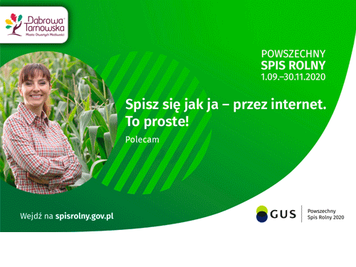 Urząd Miejski w Dąbrowie Tarnowskie przypomina, że od 1 września 2020 r. do 30 listopada 2020 r. Główny Urząd Statystyczny przeprowadza Powszechny Spis Rolny, który obejmie wszystkie gospodarstwa rolne w kraju. Udział w nim będzie obowiązkowy – rolnicy mogą dokonać samospisu w internecie, ale ci, którzy tego nie zrobią, nie mogą odmówić udzielenia informacji rachmistrzom w bezpośrednich lub telefonicznych wywiadach. Zebrane dane posłużą do kształtowania krajowej polityki rolnej oraz analizy zmian zachodzących w polskim rolnictwie w latach 2010–2020. Podobne spisy będą przeprowadzone we wszystkich krajach Unii Europejskiej. Czytaj dalej