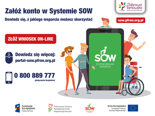Państwowy Fundusz Rehabilitacji Osób Niepełnosprawnych, chcąc zwiększyć dostępność wsparcia dla Osób z Niepełnosprawnościami, uruchomił SOW - System Obsługi Wsparcia finansowanego ze środków PFRON. Od 1 stycznia 2020 roku wniosek dotyczący dofinansowania turnusu rehabilitacyjnego a także przedmiotów ortopedycznych aplikujący o dofinansowanie ze środków PFRON może złożyć przez Internet - bez wychodzenia z domu, 365 dni w roku. System SOW jest obecnie wdrażany na bardzo szeroką skalę w jednostkach samorządu powiatowego nie tylko na terenie województwa małopolskiego, a także w całej Polsce. W Małopolsce do Systemu Obsługi Wsparcia przystąpiły już wszystkie 22 powiaty. Czytaj dalej