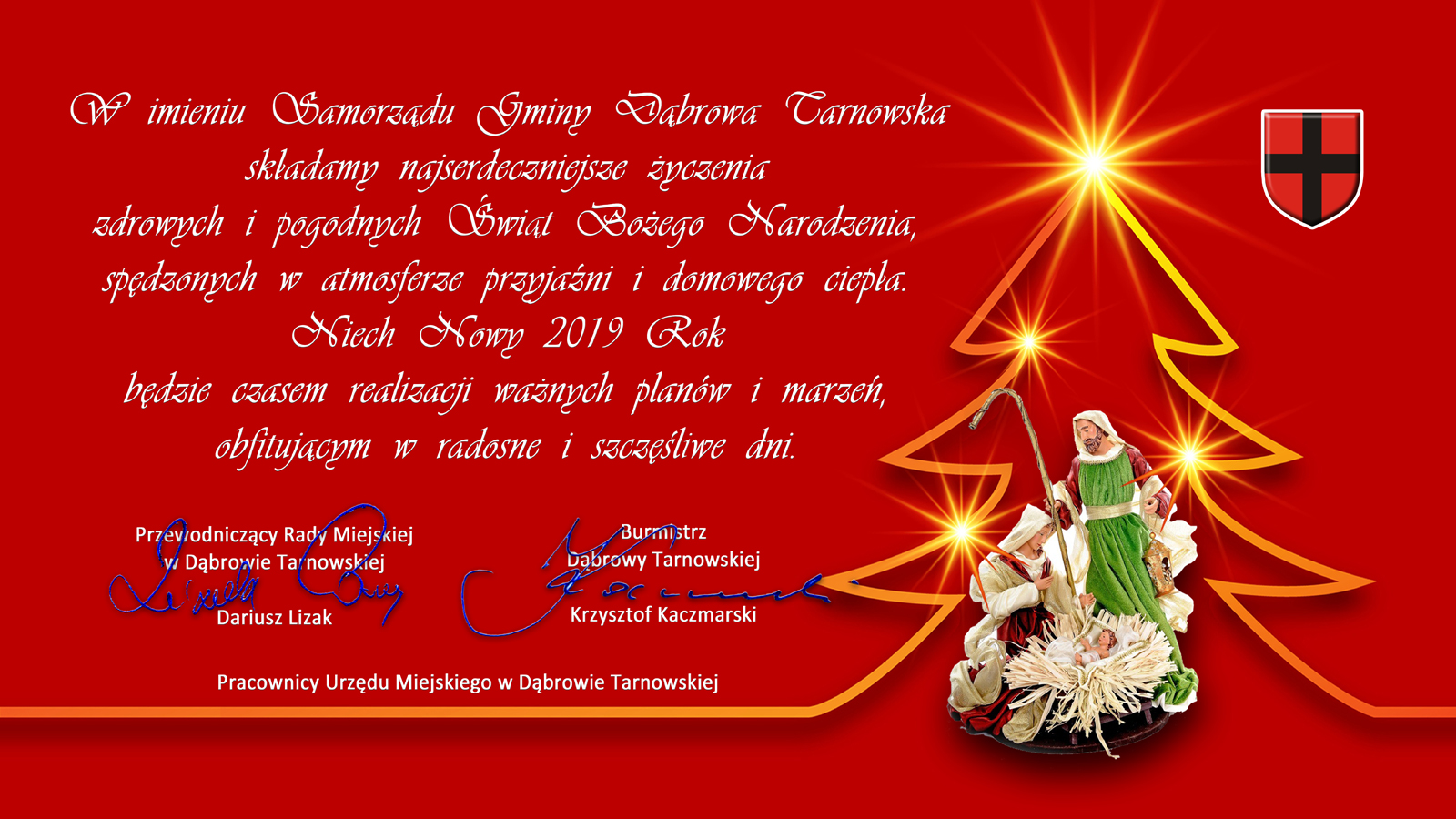 Samorząd Gminy Dąbrowa Tarnowska składa podziękowania dla wszystkich osób i instytucji, które przesłały na adres Urzędu Miejskiego, Rady Miejskiej i Burmistrza Dąbrowy Tarnowskiej kartki świąteczne i noworoczne z życzeniami wszystkiego najlepszego. Te liczne wyrazy pamięci i dowody sympatii, które dotarły do nas w okresie przedświątecznym sprawiły nam dużą przyjemność. Każda z kartek miała swój udział w tworzeniu świątecznej atmosfery i za każdą jeszcze raz serdecznie dziękujemy.