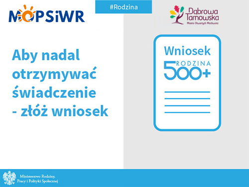 Wszyscy, którzy chcą korzystać ze świadczeń z Programu "Rodzina 500 plus" - także ci, którzy otrzymywali je dotychczas, muszą złożyć nowe wnioski. Będzie to można zrobić już od 1 sierpnia - zarówno osobiście w Miejskim Ośrodku Pomocy Społecznej i Wsparcia Rodziny w Dąprowie Tarnowskiej przy ul. Kościuszki 15A, jak i elektronicznie, za pośrednictwem ministerialnego Portalu Informacyjno - Usługowego Emp@tia, bankowości elektronicznej, PUE ZUS – Platforma Usług Elektronicznych ZUS oraz Profilu Zaufanego. Nowy okres zasiłkowy świadczeń rodzinnych obejmujący także świadczenie z Programu "Rodzina 500 plus", rozpoczyna się 1 października. Czytaj dalej