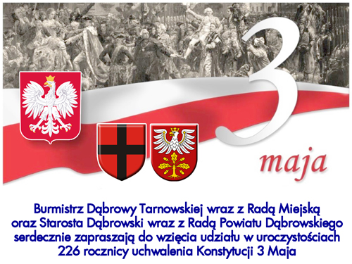 Burmistrz Dąbrowy Tarnowskiej wraz z Radą Miejską oraz Starosta Dąbrowski wraz z Radą Powiatu Dąbrowskiego serdecznie zapraszają wszystkich, a szczególnie Mieszkańców Miasta Dąbrowa Tarnowska, oraz całego Powiatu Dąbrowskiego, jak również miłych Gości do wzięcia udziału w uroczystościach obchodów 226 Rocznicy Uchwalenia Konstytucji 3 Maja. W programie obchodów oprócz patriotyczno – religijnych uroczystości głównych przewidziano wiele atrakcyjnych imprez towarzyszących, zarówno o charakterze sportowym jak i kulturalnym, spośród których każdy będzie mógł znaleźć coś dla siebie. Czytaj dalej