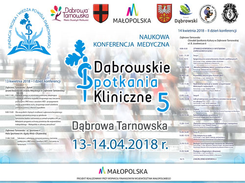 Od kilku lat w Dąbrowie Tarnowskiej organizowana są naukowe konferencje medyczne – Dąbrowskie Spotkania Kliniczne. Najbliższe 5. Dąbrowskie Spotkania Kliniczne (4DSK), które odbędą się w dniach 13-14 kwietnia br. poświęcone zostaną w całości problematyce "Wybrane choroby cywilizacyjne w codziennej pracy lekarzy praktyków – postępy w diagnostyce i leczeniu". Celem tegorocznej konferencji – 5DSK, jest zawiązanie współpracy oraz wymiana wiedzy pomiędzy lekarzami różnych specjalności praktykujących w ambulatoriach, przychodniach, szpitalach, ośrodkach ratownictwa oraz osób pracujących w szkołach i poradniach z wybitnymi pracownikami naukowymi i klinicznymi wiodących ośrodków akademickich w Polsce. Konferencja V Dąbrowskich Spotkań Klinicznych, odbędzie się 14 kwietnia 2018 r. od godz. 9:00 w Ośrodku Spotkania Kultur w Dąbrowie Tarnowskiej. Szczegóły na www.dsk.org.pl. Organizatorem 5DSK jest Fundacja Troska i Wiedza Powiśla Dąbrowskiego przy współpracy z Urzędem Miejskim w Dąbrowie Tarnowskiej, Starostwem Powiatowym, dąbrowskim kołem Polskiego Towarzystwa Lekarskiego oraz Biurem Doradczo – Usługowym BHP Andrzeja Dziedzica. Przewodniczącym Komitetu Organizacyjnego i Naukowego konferencji jest Prof. zw. dr hab. n. med. Ireneusz Kotela. Konferencja jest realizowana przy wsparciu finansowym Województwa Małopolskiego. Czytaj dalej
